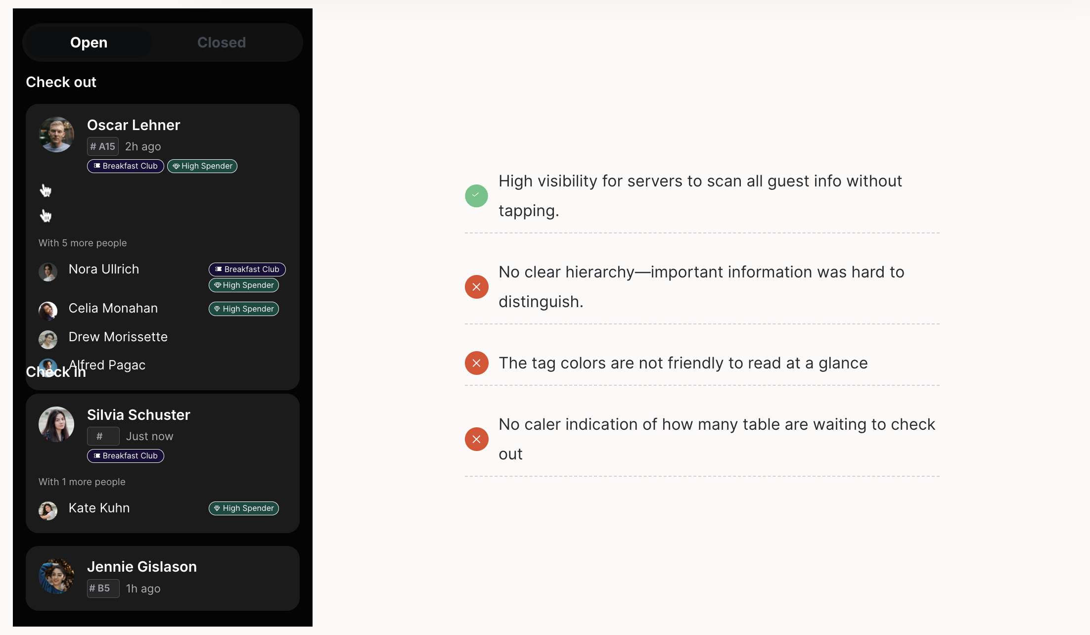 After exploring the product ecosystem, I realized groups often check in under one name for billing. This allowed us to shift reward visibility from individuals to table-level, reducing server effort. My first design exploration focused on how to surface all guest reward insights in a single, scannable table card, helping servers quickly act without cognitive overload.We send this version with two partner restaurants as “causula” testing due to time constraints. The response was positive: staff found the guest tags intuitive and much clearer than abstract scores. They could immediately identify guest value levels and appreciated having insights readily visible in Sidecar. However, they also noted that displaying all guest data could overwhelm, especially for large parties.