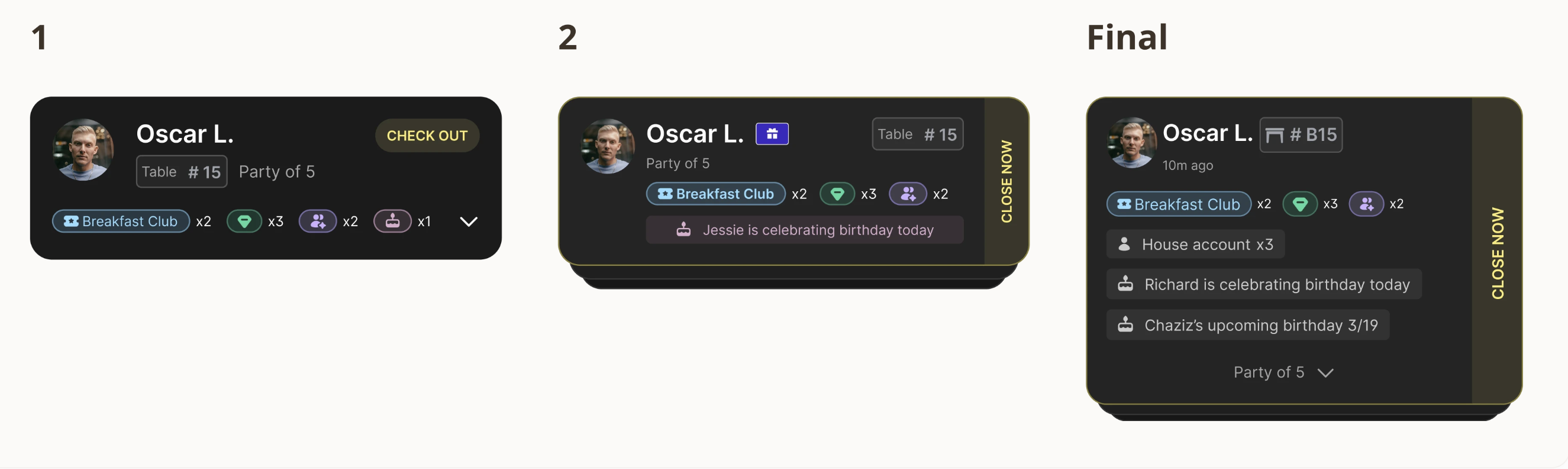 Before closing the tab, servers are presented with a clear, structured summary of:Applicable rewards (e.g., Breakfast Club x2)Celebration cues (Birthday gift x1)Industry affiliationsHigh-value guest indicatorsEach tag is paired with a behavioral prompt (e.g., “Show guests some industry love”).This reframes loyalty data into:Actionable service cues.