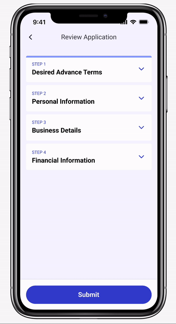 At the end of the application process, I integrated a review section for users to verify their information before submission. Each part of the application can be expanded or collapsed for ease of review, with an 'Edit' option available for quick adjustments.